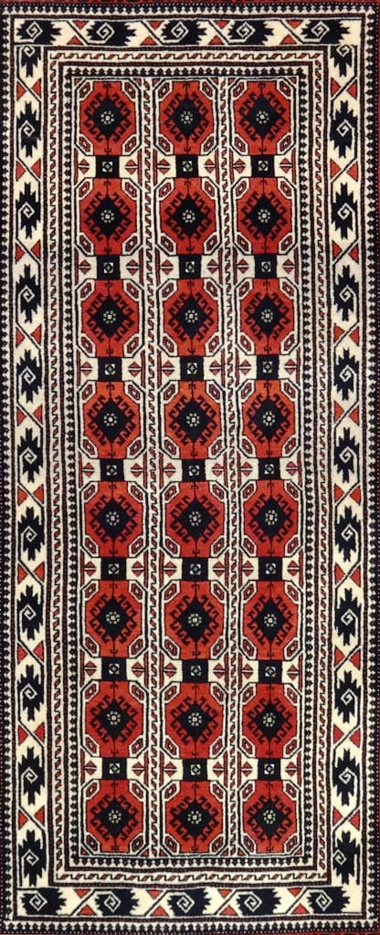 Zona di provenienza nord est dell’Iran, nodo doppio molto serrato e la trama in cotone danno come risultato un tappeto molto robusto.