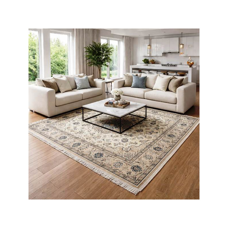 Il colore beige di base, disegno floreale in più bordo chiaro liscio, inoltre ha il medaglione centrale creano un tappeto molto fine e piacevole.